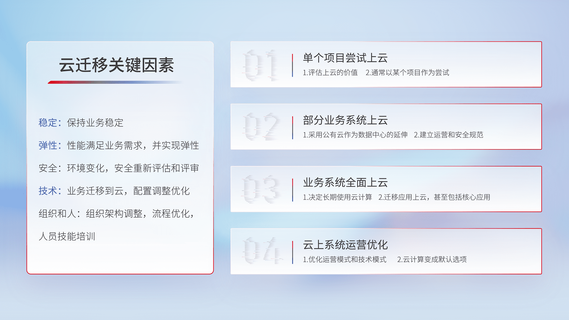 结合实际业务,,,,从规划设计、、、、云平台选型、、、云原生改造、、数据迁移、、集成交付,,,,迁移全过程为客户识别最佳上云路径,,,,做好风险识别管理,,,设计网络架构、、、、身份权限、、、安全审计合规、、操作审计、、、、日志审计、、、监控告警策略、、、多站点容灾设计等,,对云上基础设施进行整体规划,,提升IT治理水平,,以满足弹性、、、、高可用、、高性能的需求。。。