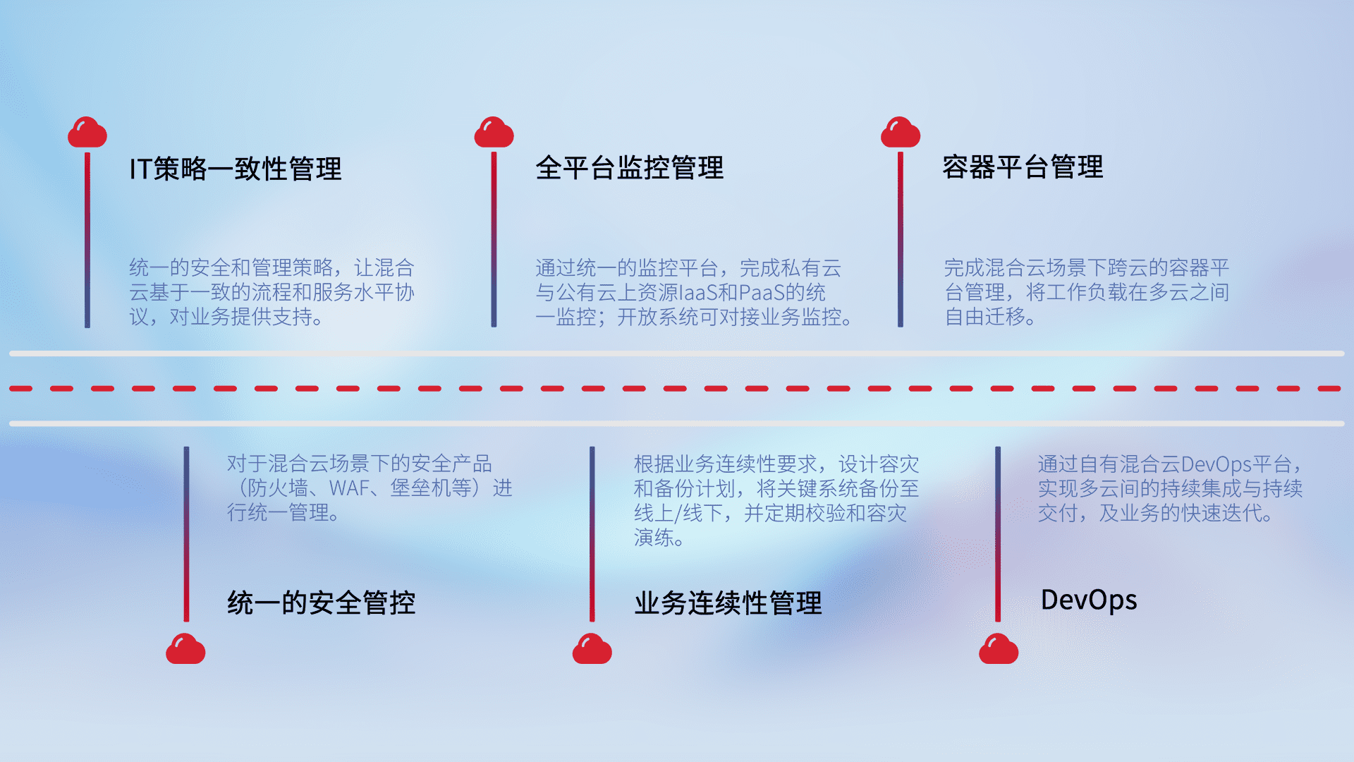 通过多云纳管,,,,以统一的资源数据模型把客户的云资源进行抽象和封装,,进而实现对多云资源的统一操作,,保障云资源管理的可靠性、、、、稳定性与可用性。。。量身定制化运维内容,,,配置、、、、开发运维、、、补丁管理、、、、备份、、监控、、认证和访问管理、、、、审计和日常巡检等,,,,保障在用云过程中的可靠度,,稳定度以及高可用率。。