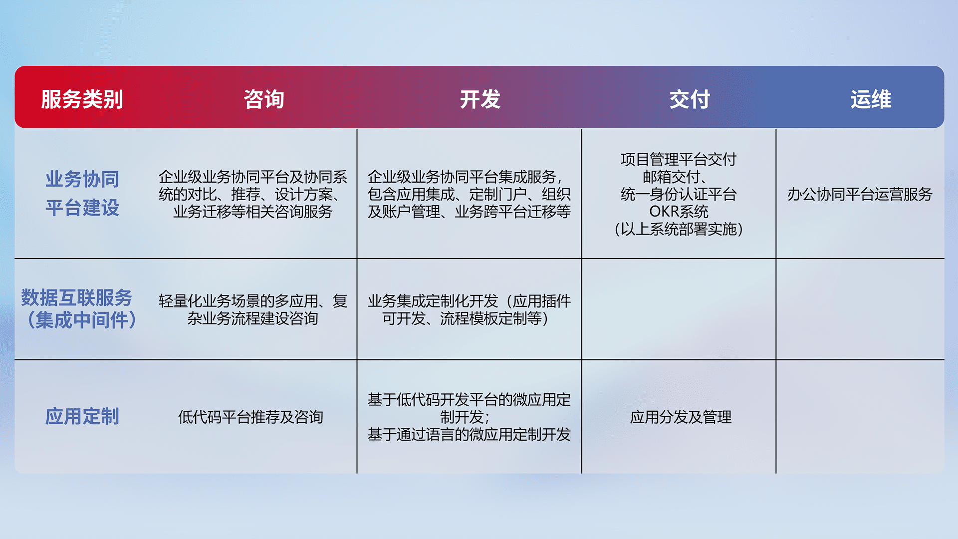 针对钉钉、、企微、、、、IDaas等平台级产品提供产品的规划、、、、方案、、交付、、定制化开发等服务,,,实现如统一协同办公、、、智能客户服务、、混合会议管理、、、、智能数据查询、、等业务场景,,,,实现数字化转型。。。